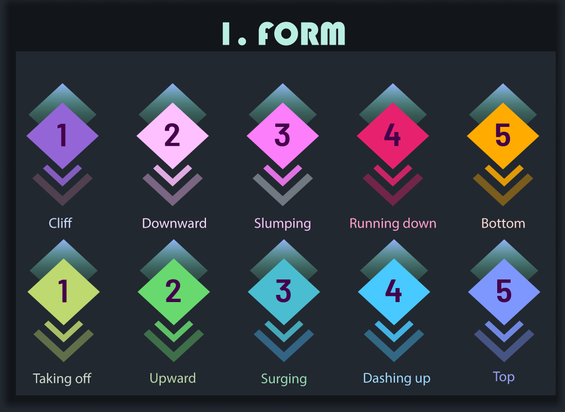 | ■ ■ ■ | 6. 離陸 (Take off) | ② Pulse 💓/⑬ Step 🌓↑ | ⑰ Surge 🌩️/⑦ Flash 💫 | 等間隔の加速列→小段差で上向きへ移行 |