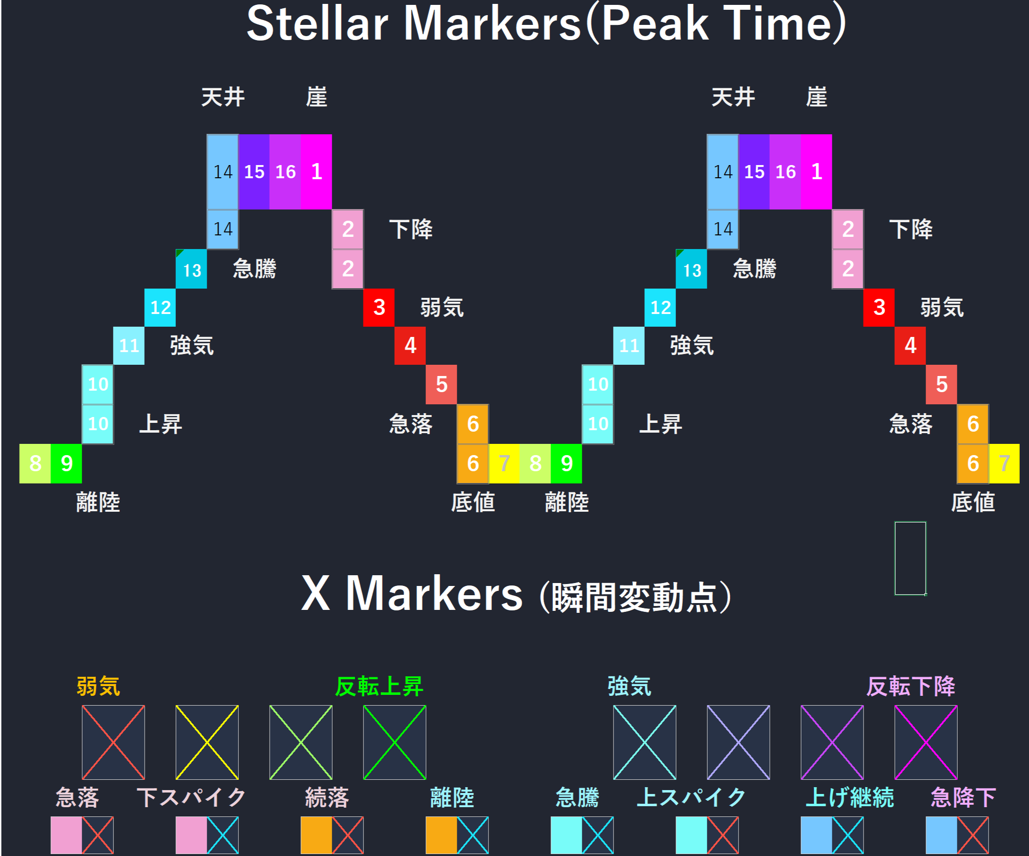 | ■ ■ ■ | 10. 天井 (Top) | ③ Box🔴/⑧ Sine 🟢/⑪ Beat ⚔️ | ④ Feint🫧/⑱ Pullback 🌦️ | 上端で供給・中央で減速、往復化して配分・整理フェーズ |